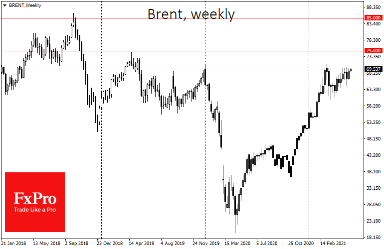 Выше уровня $70 на графике Brent нет значимых уровней сопротивления, вплоть до $75 – пиков 2019 года, поэтому достижение их может оказаться лёгким и быстрым. Впрочем, для этого потребуется значимый новостной повод. Им может стать заседание совета ОПЕК на этой неделе или месячный отчёт по рынку труда в США в пятницу.