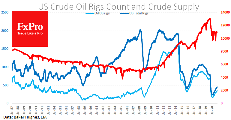 Однако новых буровых достаточно лишь для удержания добычи на уровне 11 млн баррелей в сутки, где она стабилизировалась с сентября прошлого года. На пике, в марте 2020 она превышала 13 млн баррелей в день. Даже двухлетние максимумы цен и экстремально благоприятные финансовые условия на рынках не воодушевляют на активную экспансию.