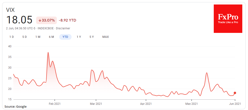 Рынки находятся в несколько подвешенном состоянии, ожидая новых данных Nonfarm Payrolls в пятницу, а также сигналов монетарных властей. Последнюю неделю Nasdaq100 и S&P500 постепенно проседают на низких объемах, отражая настороженность инвесторов в ожидании новых сигналов. Индекс VIX вчера подскочил на 7% до 18, хотя ранее курсировал вблизи минимумов года около 16.7.