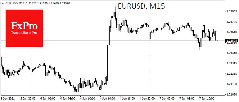 EURUSD в пятницу поднималась от внутридневных минимумов на 1.2100 до 1.2180 и выше. Однако этот импульс не оказался устойчивым, а пара вернула почти половину прироста, остановившись у 1.2150 к началу европейской сессии.
