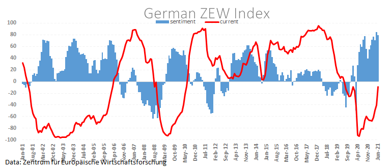 Среди опубликованных сегодня данных выделяется падение промпроизводства в Германии за апрель на 1% (ожидался рост на 0.3%). Отдельно от этого индекс делового климата от ZEW упал с 84.4 в мае до 79.8, вопреки ожиданиям роста до 86. Комментарии ZEW связывают снижение индикатора с высокой оценкой текущей ситуации, что сокращает потенциал дальнейшего улучшения.