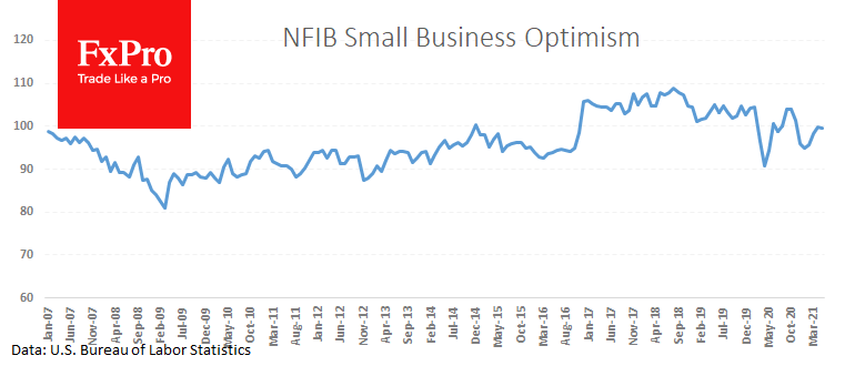 Индекс оптимизма малого бизнеса США также снизился с 99.8 в апреле до 99.6 в мае, вопреки прогнозам на рост до 101.2. Рост оптимизма стал на паузу, так как нехватка рабочей силы замедляет рост.