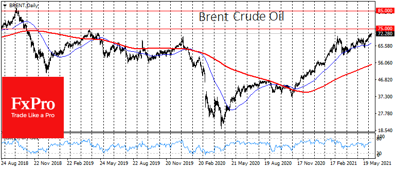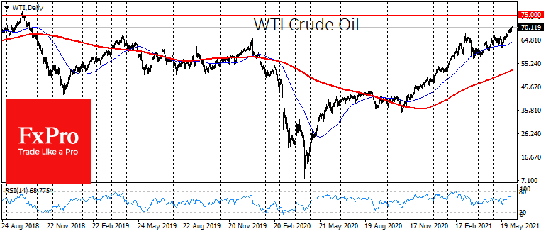 На текущих уровнях у $70.30 американская WTI торговалась в последний раз в октябре 2018 года. За последние годы в Brent пик был выше $75, куда цена подскакивала в 2019 на фоне реакции на атаку дронов перерабатывающих мощностей в Саудовской Аравии.