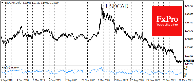 Валютный рынок - более глубокий и ликвидный, поэтому остановку в снижении USDCAD мы воспринимаем с настороженностью. Вполне возможно, что и по Brent мы увидим потерю импульса роста вблизи $75 за баррель.