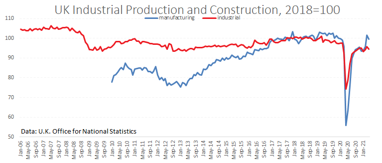 Промышленное производство в Британии прибавляет 27.5% к апрелю прошлого года, но тут мало повода для оптимизма, так как в абсолютных значениях индекс находится на 3% ниже уровней на февраль 2020 и на 6.5% ниже локального пика в марте 2019 года. То есть мы видим возобновление тренда на стагнацию сектора, вероятно, вызванную Brexit.