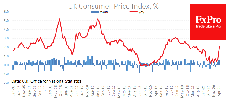 Потребительские цены выросли за май на 0.6%, как и месяцем ранее и вдвое сильней ожиданий. Рост цен тому же месяцу годом ранее превысил 2%, достигнув таргета Банка Англии. Динамика цен производителей настраивает на дальнейшее ускорение в ближайшие месяцы.