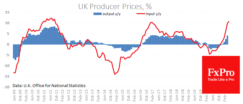 Инфляция в Британии продолжает ускоряться сильней прогнозов аналитиков, а закупочные цены производителей все больше уходят на территорию двухзначных темпов к тому же месяцу годом ранее.