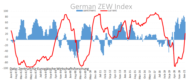 Позже ZEW опубликовала не менее разочаровывающие оценки деловых настроений к июлю. Индекс упал с 79.8 до 63.3, самого низкого значения с января. Оценка текущей ситуации резко улучшилась, так что значительная часть негатива пришлась на ослабление ожиданий, резонируя с провалом производственных заказов.