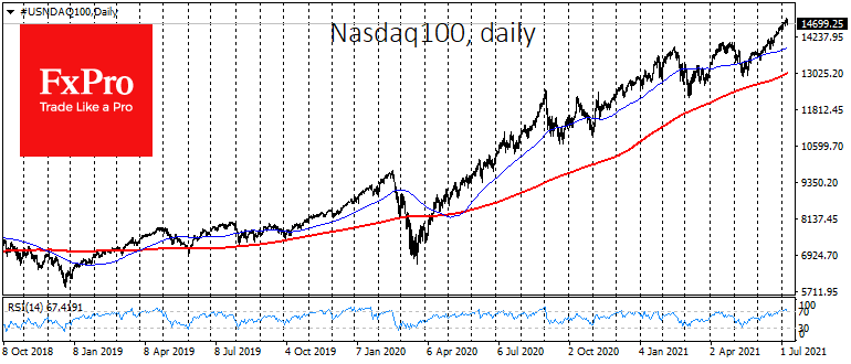 Индекс RSI на дневных графиках Nasdaq100 вчера был на максимумах с августа прошлого года, отмечая внушительную локальную перекупленность. В этих условиях краткосрочным покупателям может оказаться выгодней на пару-тройку дней перейти в позицию наблюдателей и не спешить выкупать внутридневные просадки.