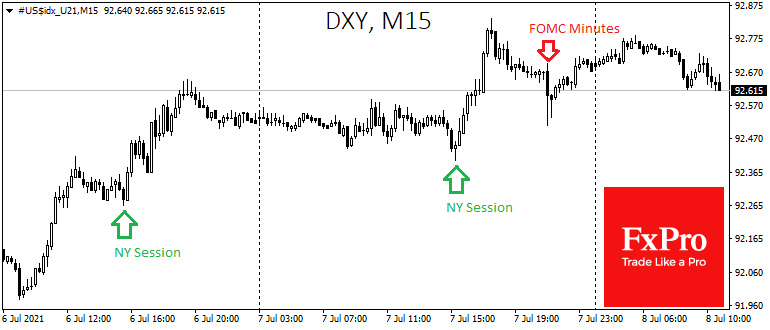 Американский доллар вчера вечером обновил трехмесячные максимумы к корзине из основных валют, однако, его наступление приостановилось после публикации протоколов FOMC.