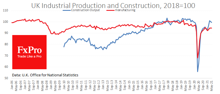 Пакет статистики по Британии, опубликованной в начале дня, усилил опасения, что пик восстановления позади. Месячные оценки отметили рост ВВП за май на 0.8%, почти вдвое слабей средних прогнозов в 1.5%. Обрабатывающая промышленность сократилась на 0.1% вопреки ожиданиям роста на 0.9% после стагнации в апреле. Активность в строительстве снизилась на 0.8% после падения на 0.7% месяцем ранее.