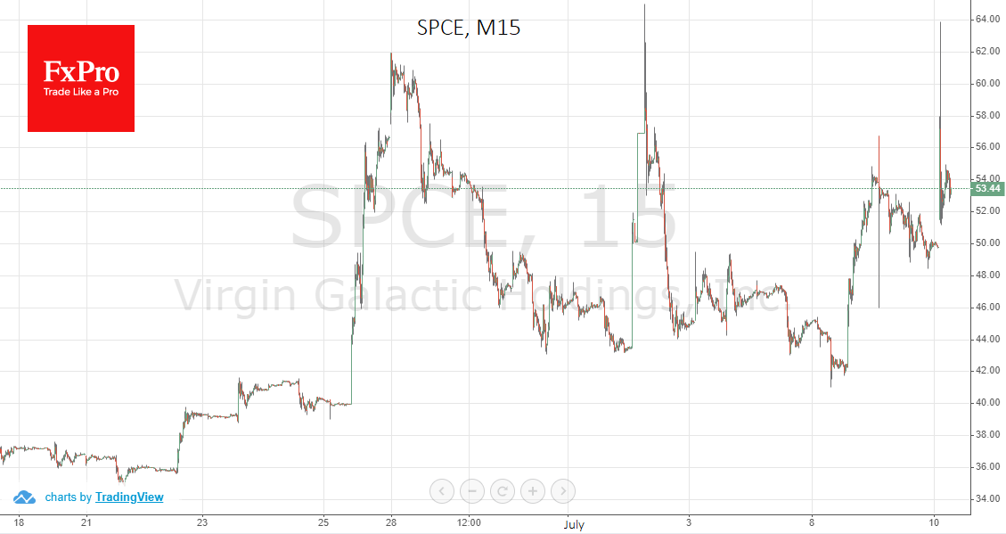 Из отдельных звезд дня стоит упомянуть Ричарда Брэнсона, чей успешный полет на корабле Virgin Galactic всполошил мировые СМИ и инвесторов. На утренних торгах на Санкт-Петербургской бирже в первые минуты котировки взлетели до максимумов за всю историю компании - $63.52, но позже вернулись к уровням вблизи $54, сократив прирост с начала дня до 8%. Впрочем, наиболее показательной будет динамика акции ближе к открытию американских торгов с увеличением ликвидности.