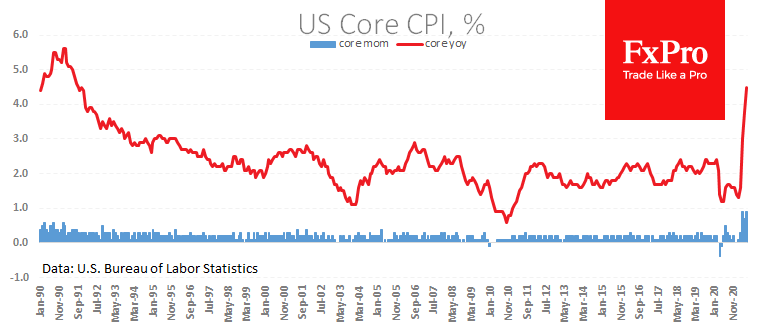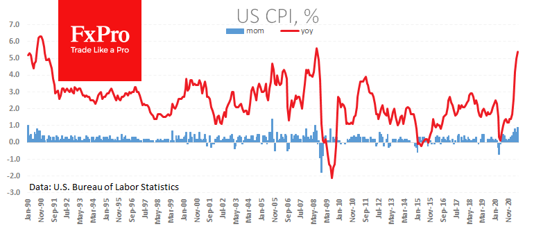 Спекулятивным рефлексом рынка на инфляционные данные является покупка доллара и давление на акции в ожидании сворачивания стимулов и переоценки ожиданий повышения ставок. Однако более долгосрочным инвесторам стоит дождаться комментариев ФРС. Уверенность от Пауэлла и Ко о временном характере инфляции обещает нанести удар по доллару, так как рынки вернутся к закладыванию в котировки высоких инфляционных ожиданий и отрицательной реальной доходности.