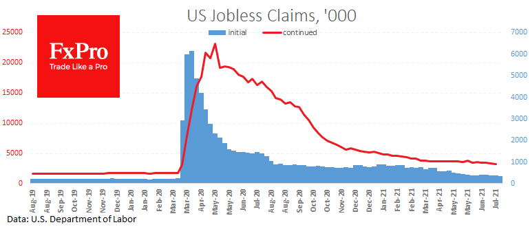 Число первичных обращений за пособиями по безработице на прошлой неделе упало до 360 тыс. (ожидалось 350 тыс.). Число повторных обращений упало на 126 тыс. до 3.241 млн. В обоих случаях это минимальные уровни с начала пандемии и окончание застоя в показателях.