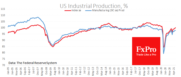 Другая порция данных касалась промпроизводства. Загрузка мощностей выросла до 75.4%, что очень близко к уровню 76.3% в феврале 2020. Индекс промышленного производства на 1.2% ниже уровней до пандемии.