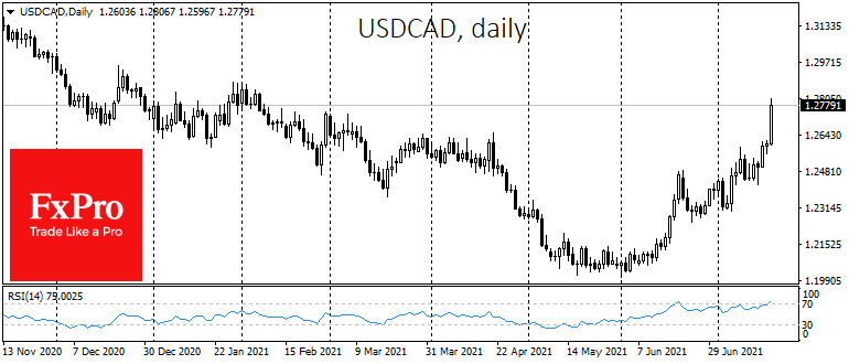 На валютном рынке также преобладает тяга в защитные активы. Пара USDCAD укрепилась на области максимумов с марта, методично прибавляя с начала июня. Большая часть этого роста происходила при укреплении цен на золото и при высоких нефтяных котировках, что говорит о сильной тяге в доллары на американском рынке.