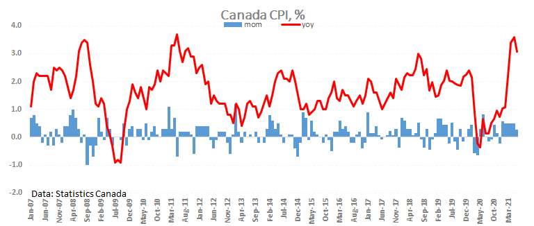 Темпы роста цен в Канаде пошли на спад, снизившись до 3.1% г/г по итогам июня после 3.6% месяцем ранее. При этом месячная динамика остается положительной (+0.2%), хотя и слабей ожиданий (+0.4%) и прошлых значений (+0.5%).