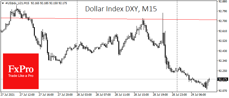 Больше определенности можно увидеть на валютном рынке, где доллар испытывает давление. На внутридневных графиках хорошо заметен перелом в сторону ослабления: индекс доллара сначала подскочил с 92.5 до 92.77, а далее оказался под устойчивым давлением, опустившись до 92.1 к началу европейских торгов в четверг.