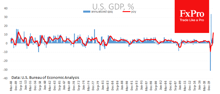 Штаты неожиданно оказались на другом конце спектра, выдавая данные слабей ожиданий. Первая оценка ВВП за второй квартал отметила прирост на 6.5%, слабей ожидавшихся 8.5% и почти вровень с ростом в первом квартале (6.3%).
