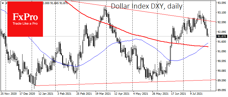 Не стоит забывать и о фундаментальной причине ослабления американской валюты: высокая инфляция разъедает ее покупательную способность. Сейчас доходность двухлетних облигаций США составляет 0.2% при инфляции в 5.4% и прогнозах роста цен на 3.4% в 2021 и 2.1% в 2022.