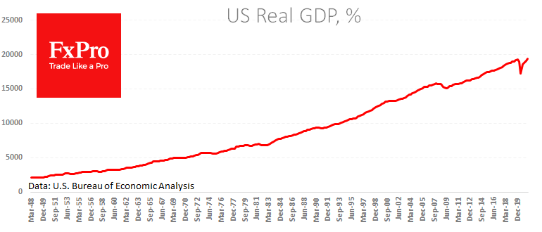 Согласно предварительным оценкам американского ВВП за второй квартал, размер экономики на 0.5% превысил пик перед пандемией. Однако темпы роста в прошлом квартале все же не ускорились, как того ожидало большинство экономистов. Аннуализированный прирост составил 6.5% против 6.3% кварталом ранее.