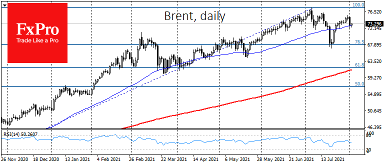 В частности, на графике нефти хорошо видно, как участились сильные просадки в последние недели. Котировки Brent уже не отрываются так сильно и так надолго от своей 50-дневной скользящей средней, хотя пока и находят поддержку на спадах.