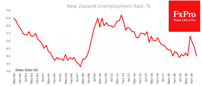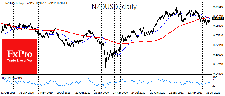 Новозеландский доллар растёт второй день подряд по 0.5%, превысив значимый круглый уровень 0.7000 на сильных показателях рынка труда. Занятость выросла на 1% во втором квартале после 0.6% в первом. Уровень безработицы во втором квартале упал до 4% с 4.6%, вернувшись на уровни до пандемии. Формально, у РБНЗ нет препятствий для нормализации монетарной политики, ведь инфляция, ВВП и занятость уже полностью восстановились. К тому же зарплаты подскочили за предыдущие 3 месяца на 1.2%, выдав самый резкий скачок с 2008 года.