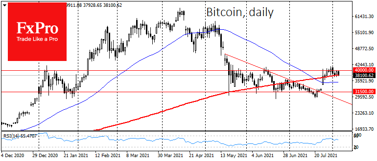 Со стороны теханализа, биткоин в среду получил поддержку покупателей на спаде к 200-дневной простой скользящей средней, но не сумел развить рост, в четверг вновь вернувшись к этой линии. Хотя важно учитывать, что последние два месяца (почти вечность для крипторынка) первой криптовалюте не удается развить наступление выше $40K.
