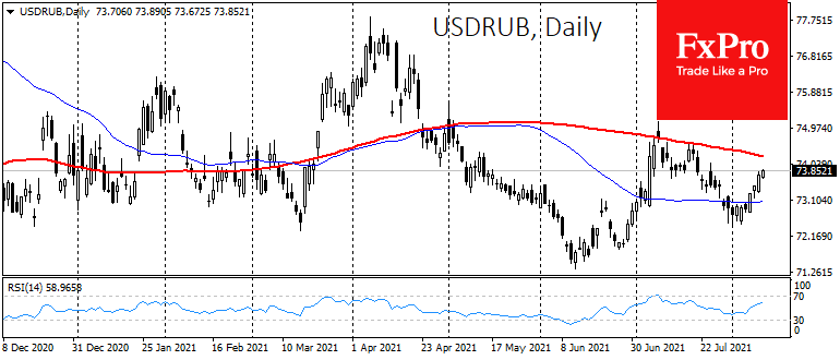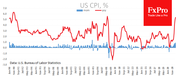 Во-вторых, важной проверкой для доллара выступит сегодняшняя публикация потребительской инфляции в США за июль. Ожидается рост цен еще на 0.5% после скачка на 0.9% в июне. Годовые темпы, как ожидается, замедлятся до 5.3%. Последние пять месяцев фактические данные превосходили ожидания, удивляя экономистов, которые в среднем очень хорошо прогнозируют темпы роста цен. Еще один «позитивный» сюрприз способен стать тем самым камнем, который может запустить лавину покупок доллара.