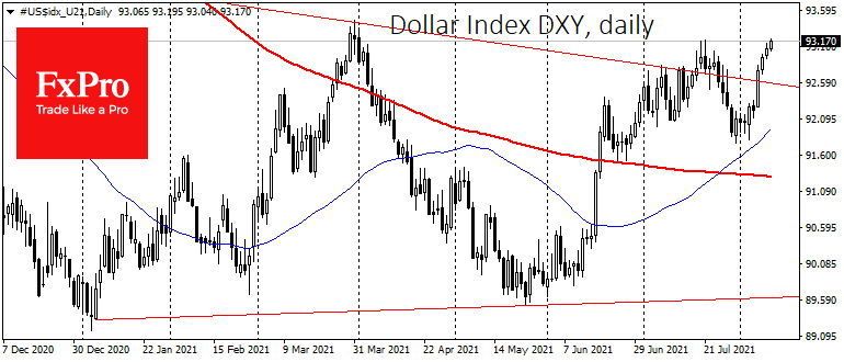 Американский доллар с начала августа прибавил 1.5% к корзине из наиболее популярных валют. Причиной послужила переоценка перспектив монетарной политики ФРС благодаря сильным данным. Прибавляя почти ежедневно с начала прошлой недели, индекс DXY вернулся к 93, области локальных максимумов, откуда уже дважды в этом году разворачивался к снижению.