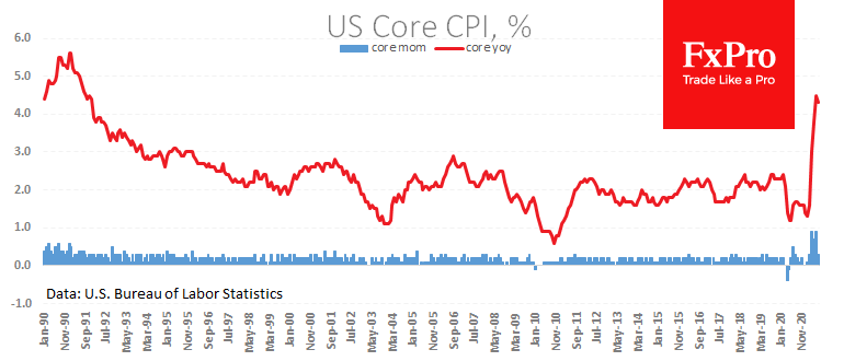Стержневой индекс, исключающий обе эти волатильные компоненты, прибавил лишь 0.3% за месяц после 0.9% месяцем ранее и замедлил годовой рост до 4.3%. Но и текущий прирост базовых цен выходит в число 10% самых значительных за последние 20 лет, так что до все еще рано говорить, что повышенная инфляция стала достоянием прошлого.