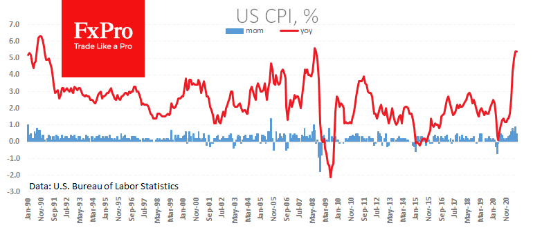 Потребительские цены в США сохраняют тревожно высокий рост. Цены за июль прибавили 0.5% (как и ожидалось), а годовой темп сохранился на 5.4%, вопреки прогнозам снижения к 5.3%.