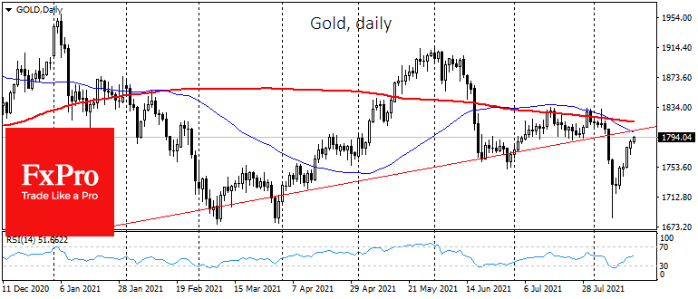 Золото прибавляет шестую торговую сессию подряд, демонстрируя настойчивый, но весьма осторожный рост. Устойчивые покупки приблизили цену к $1800, позволив ей почти восстановить позиции после бурной двухдневной распродажи, которая была спровоцирована сильными данными по рынку труда США. Несмотря на волну покупок, по золоту пока преобладают риски снижения.