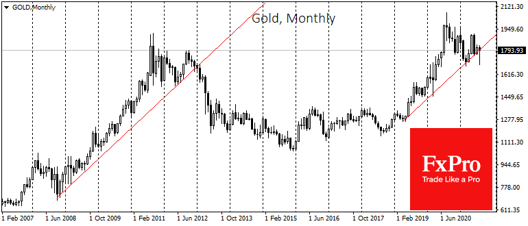 Позитивный импульс в конце прошлой недели поддержал провал потребительских настроений в США, что охладило ожидания скорого ужесточения монетарной политики и вернуло часть привлекательности золота как средства сбережения.
