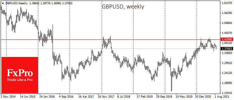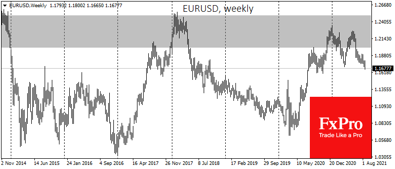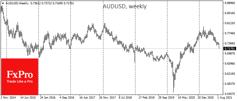 Потенциально интересной выглядит ситуация на графике AUDUSD. Пара с июня начала мягкую посадку, однако на этой неделе снижение резко набирает обороты. Рост случаев заражения и ужесточение локдауна в стране добавляет инвесторам нервозности. В случае провала с текущих 0.7190 под 0.7000 распродажа Осси может стать особенно яростной, направив курс в область 0.6300–0.6600.