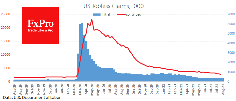 Число первичных обращений на прошлой неделе сократилось на 29 тыс. до 348 тыс. Число повторных обращений за неделю по 7 августа упало на 79 тыс. до 2.82 млн.