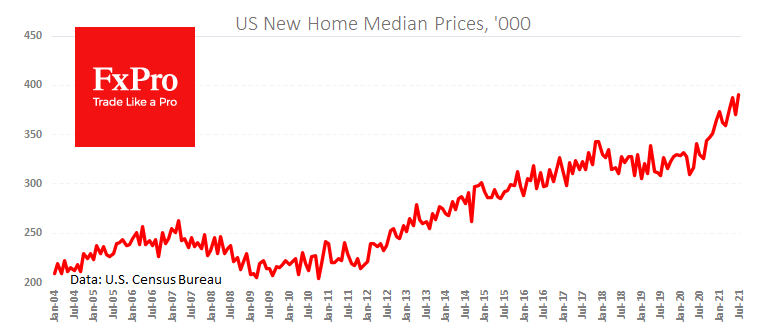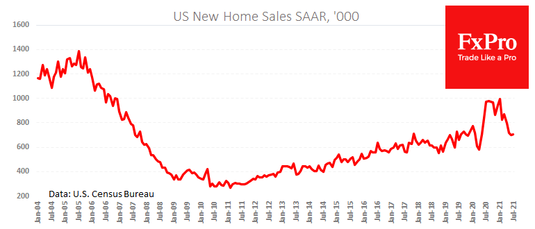 Бум на жилищном рынке в США оказался кратковременным по объемам. Чего нельзя сказать о ценах, которые продолжают обновлять максимумы. Вероятно, этот скачок цен и заставляет воздерживаться от покупки новых домов, медианная цена которых превысила 390 тыс. в июле (+18.4% г/г).