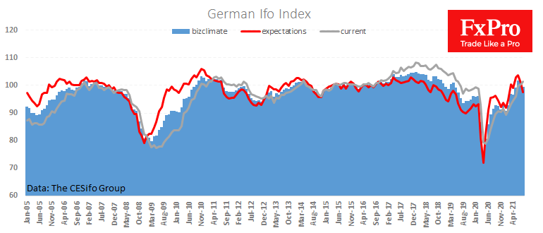 Деловой климат Германии продолжает ухудшаться, сообщает Ifo в своем месячном отчете. Второй месяц подряд падают общий индекс и компонента ожиданий. При этом оценка текущих условий продолжает улучшаться.