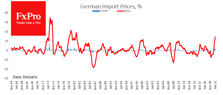 Импортные цены в Германии растут темпом 15% г/г, отмечается в последних данных Destatis. Подобные ускорения в темпах роста данного показателя можно было наблюдать только в 1970-х. Ранее рекордный темп роста отмечался в ценах производителей.
