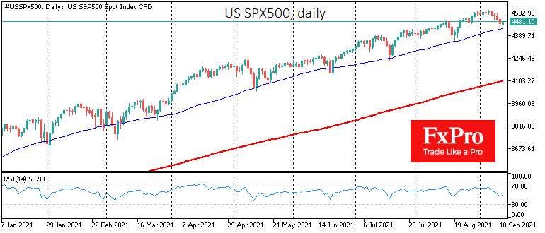 Американский S&P500 в пятницу оказался под давлением в ходе Нью-Йоркской сессии. Снижение курса усиливалось по мере приближения к закрытию торгов, что отражает настороженность профессиональных управляющих. Индекс вновь закрылся буквально в двух шагах от 50-дневной скользящей средней. Надо сказать, что S&P500 регулярно опускается к этой линии ближе к середине месяца, и так происходит с мая. Каждый раз на спаде здесь он находит внушительную поддержку.