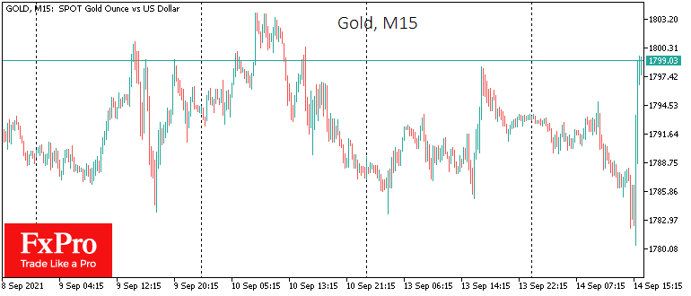 Золото отыграло внутридневные потери, поднявшись вплотную к $1800 на ослаблении доллара. Теперь стоит внимательно следить, сумеет ли золото закрепиться выше этого уровня, что расчистило бы путь для дальнейшего роста в область максимумов последних двух месяцев на $1830.