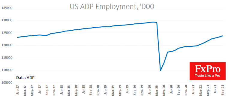 Занятость в частном секторе США с августа по сентябрь выросла на 568 тыс., сообщила ADP в традиционном отчете за два дня до официальной публикации NFP. Эти оценки значительно превзошли ожидавшиеся 425 тыс., указав на ускорение темпов роста занятости после двух месяцев слабых данных.