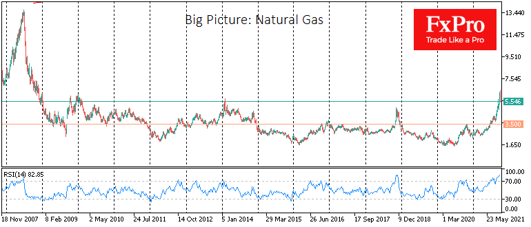 Биржевые котировки газа в США обновляли вчера 13-летние максимумы выше $6.5 за 1 млн. BTU, что на 170% выше области минимумов начала года. Стартовавшая стабилизация цен может увести котировки в область $3.5, где происходили ключевые повороты и ускорения трендов с 2009 года.