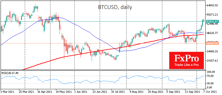 Биткоин преодолел важный психологический и технический уровень $50K и продолжает расти. Только за последние сутки BTC показал рост на 6% и торгуется около $55K. За неделю Биткоин показывает рост на 26%. Еще один важный психологический индикатор — это преодоление капитализации Биткоина свыше $1 трлн. Конечно, эта цифра имеет символическое значение, однако для многих розничных инвесторов важно увидеть способность актива преодолеть психологическое сопротивление.