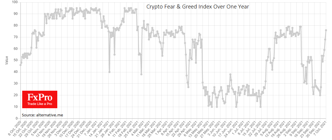 Пока же индекс доминирования Биткоина показывает довольно заметный рост, находясь в данный момент на уровне 44.5%. Индекс жадности и страха для Биткоина и крупнейших криптовалют подскочил с прошлой недели на 56 пунктов до 76 и режиму «экстремальной жадности», полностью отражая настроения на этом рынке. В комьюнити растут опасения, что в диапазоне $55K-$60K может захлопнуться ловушка для быков и инвесторов, которые покупали Биткоин уже на вершине ралли. В случае реализации такого сценария мы можем увидеть резкий разворот по мере фиксации прибыли крупными инвесторами, которые заходили в актив на $30K-$40K.