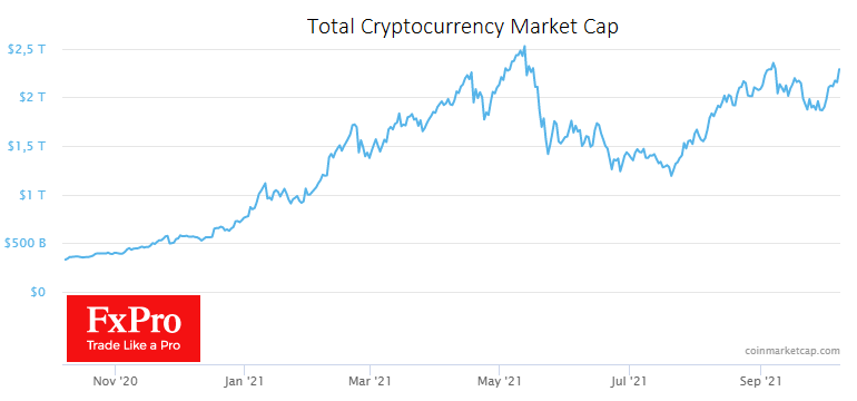 Суммарная капитализация крипторынка на данный момент составляет почти $2.3 трлн. Здесь мы также видим уверенное преодоление круглого значения и продолжение роста. На данном этапе ралли Биткоина альтернативные криптовалюты показывают менее существенную позитивную динамику. Однако с большой вероятностью альткоины догонят первую криптовалюту через какое-то время. Часто спрос на альтернативные криптовалюты усиливается вскоре после приостановки роста Биткоина. Чем дороже стоит Биткоин, тем более психологически комфортными для покупки становятся альты, в особенности для розничных инвесторов.