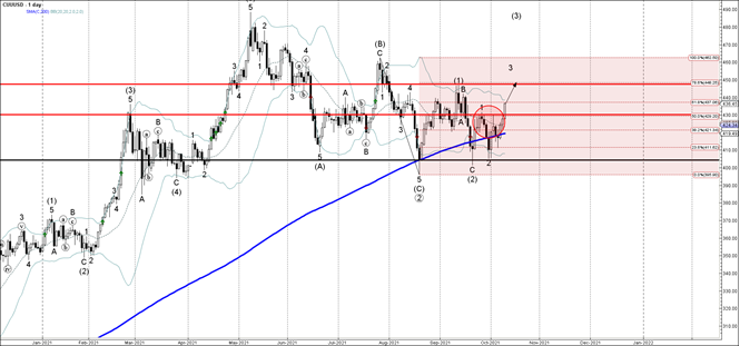 Учитывая дневной восходящий тренд, можно ожидать дальнейшего роста меди к следующему уровню сопротивления 450.00 (вершина импульсной волны (1) от сентября).