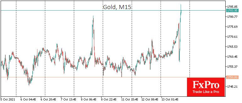 В особенности это касается золота. Покупки золота набирали обороты, уведя котировки до $1777, откуда сильные на первый взгляд цифры по CPI вызвали обвал котировок до $1757. Однако этот провал привлек еще более яростный спрос, доведя цену до $1785 на момент написания.