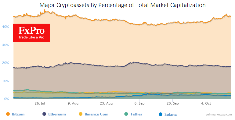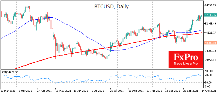 В какой-то момент вчера Биткоин перешел к коррекции, но она оказалась непродолжительной. Быки победили, не только выкупив спад, но и отправив биткоин на новые максимумы с мая. За последние сутки Биткоин демонстрирует рост на 4.5% и торгуется за $58,000. За последние 7 дней BTC вырос на 6%. Индекс доминирования Биткоина приостановил рост и сейчас находится на уровне 45.8%. Это позитивный признак, так как он указывает на усиление спроса на альтернативные криптовалюты.