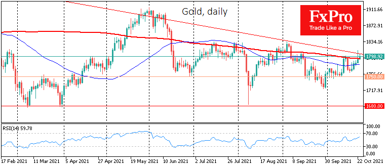 В области $1800–1810 золото оказалось у верхней границы нисходящего тренда. Попытки переломить его с июня жестко пресекались медведями. Теперь мы видим очередную попытку быков развить наступление.